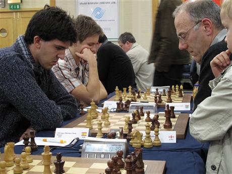 Tony Stebbings (right) playing against Spanish Grandmaster Lopez Martinez in the Gibraltar Masters tournament earlier this year. The game ended in a draw.